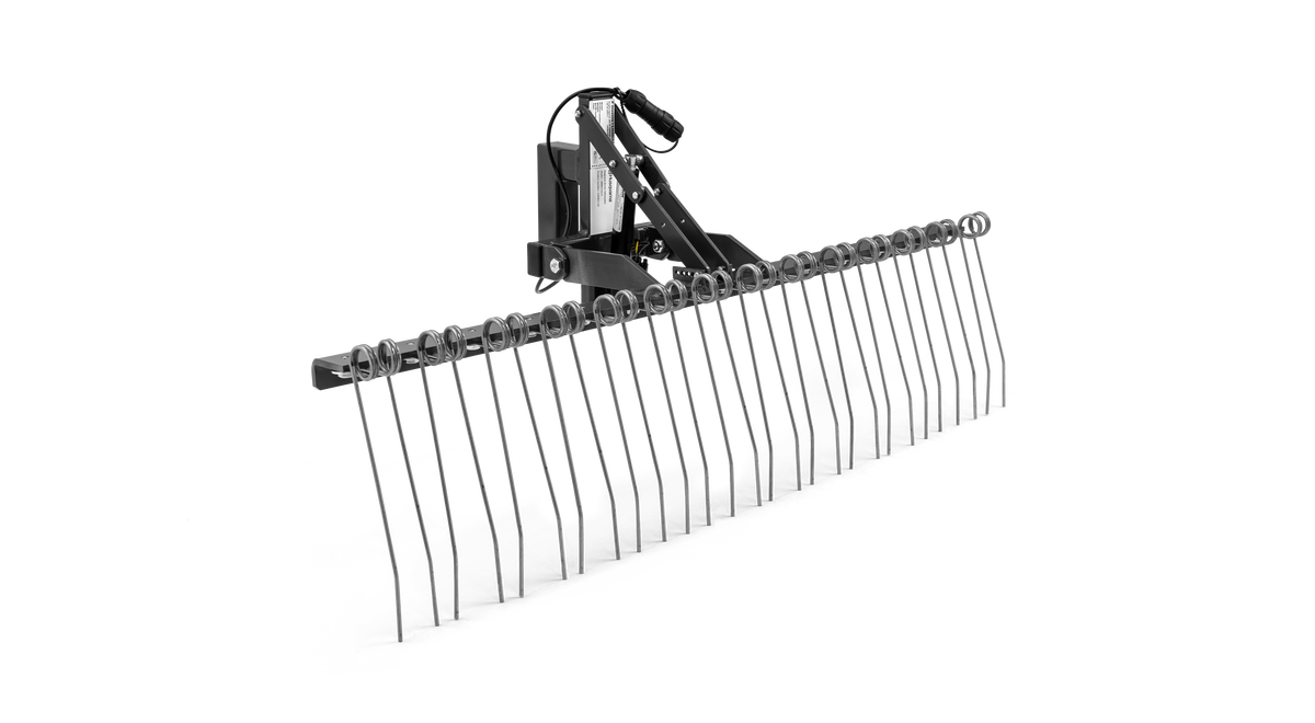 En kraftfull fjäderräfsa i stål, som används tillsammans med grusharv för utjämning av grus och uppsamling av ogräs. Reglaget för elektrisk lyft och sänkning av räfsan finns på manöverpanelen vid förarplatsen. Elektrisk styrning kräver att maskinen utrustats med kablagesats för elektriska tillbehör. – Fäste måste läggas till för installation på frontrotorklipparen.