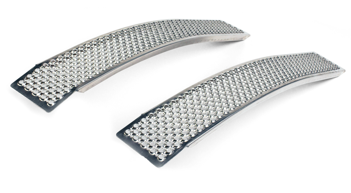 Böjda påkörningsramper gjorda av aluminium med en halkfri yta, vilket göra att alla däck får ett säkert grepp även i våta och halkiga miljöer. Påkörningsramperna passar väl att användas till släpvagnar med en höjd upp till 700 mm och klarar max total last på 450 kg/par.